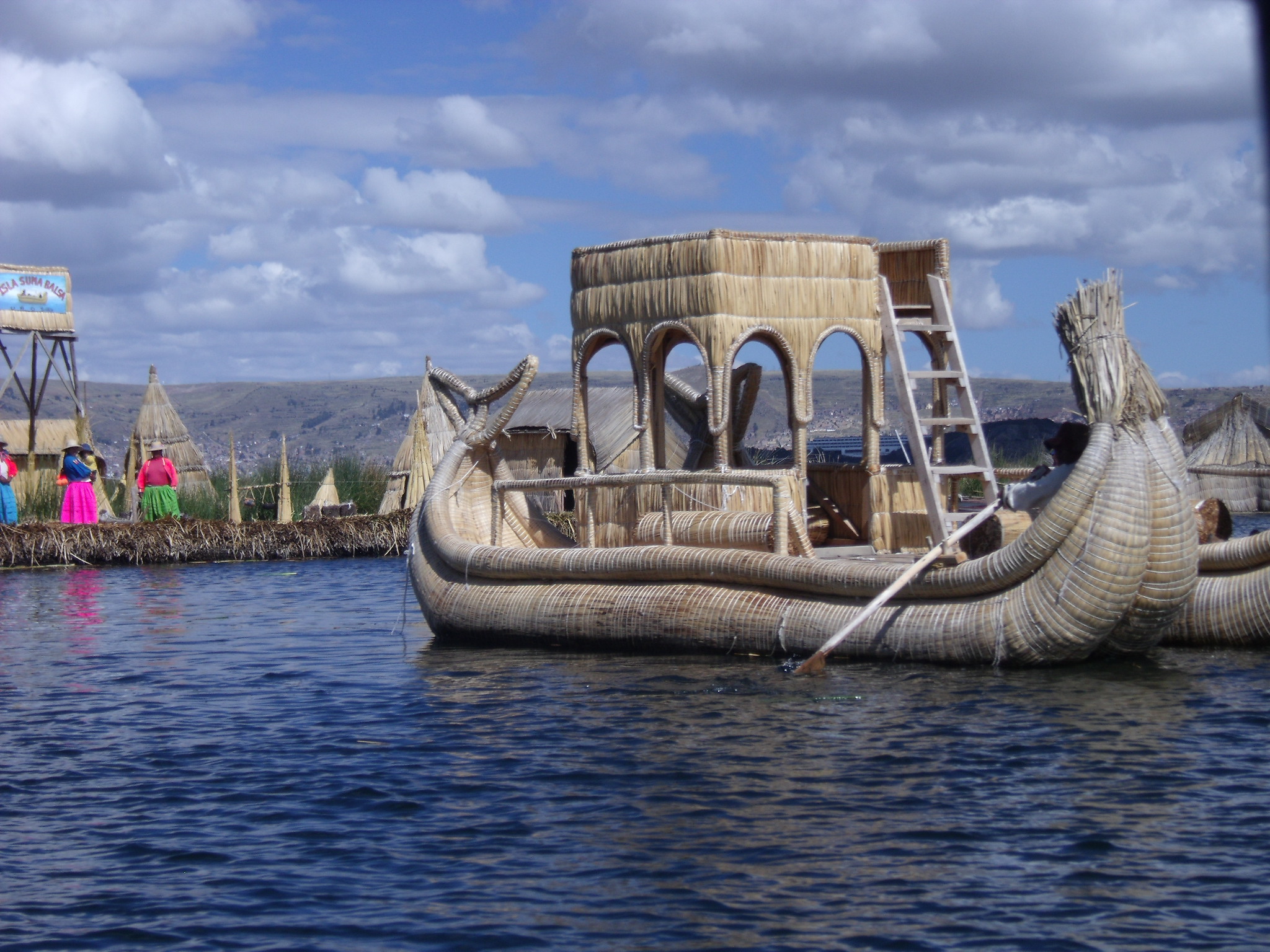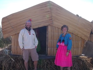 The morning, however, was spent visiting the floating islands of Uros. They’re made of reeds, as is pretty much everything on the island, and we learnt about their construction and traditions, met the people, saw their huts and tried on their clothes (with their permission). We declined to purchase their wares, although I think you’ll agree that I cut the jib in the alpaca shirt.